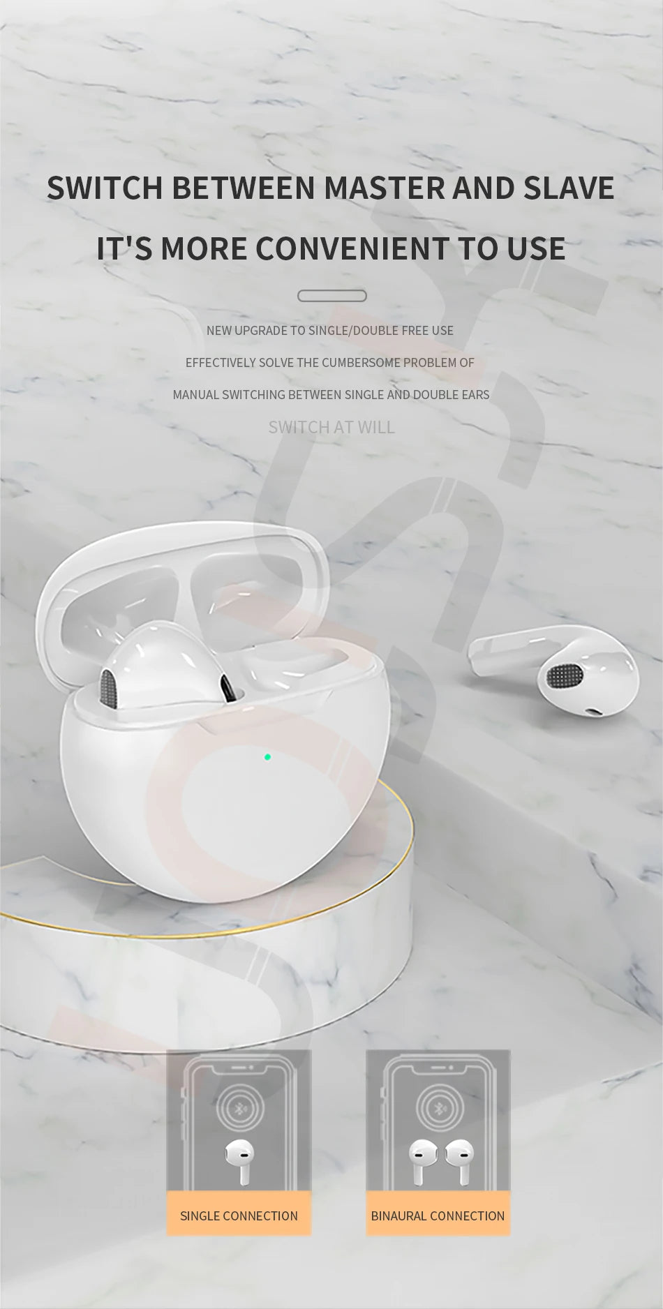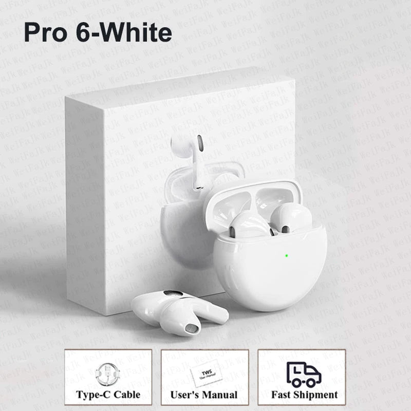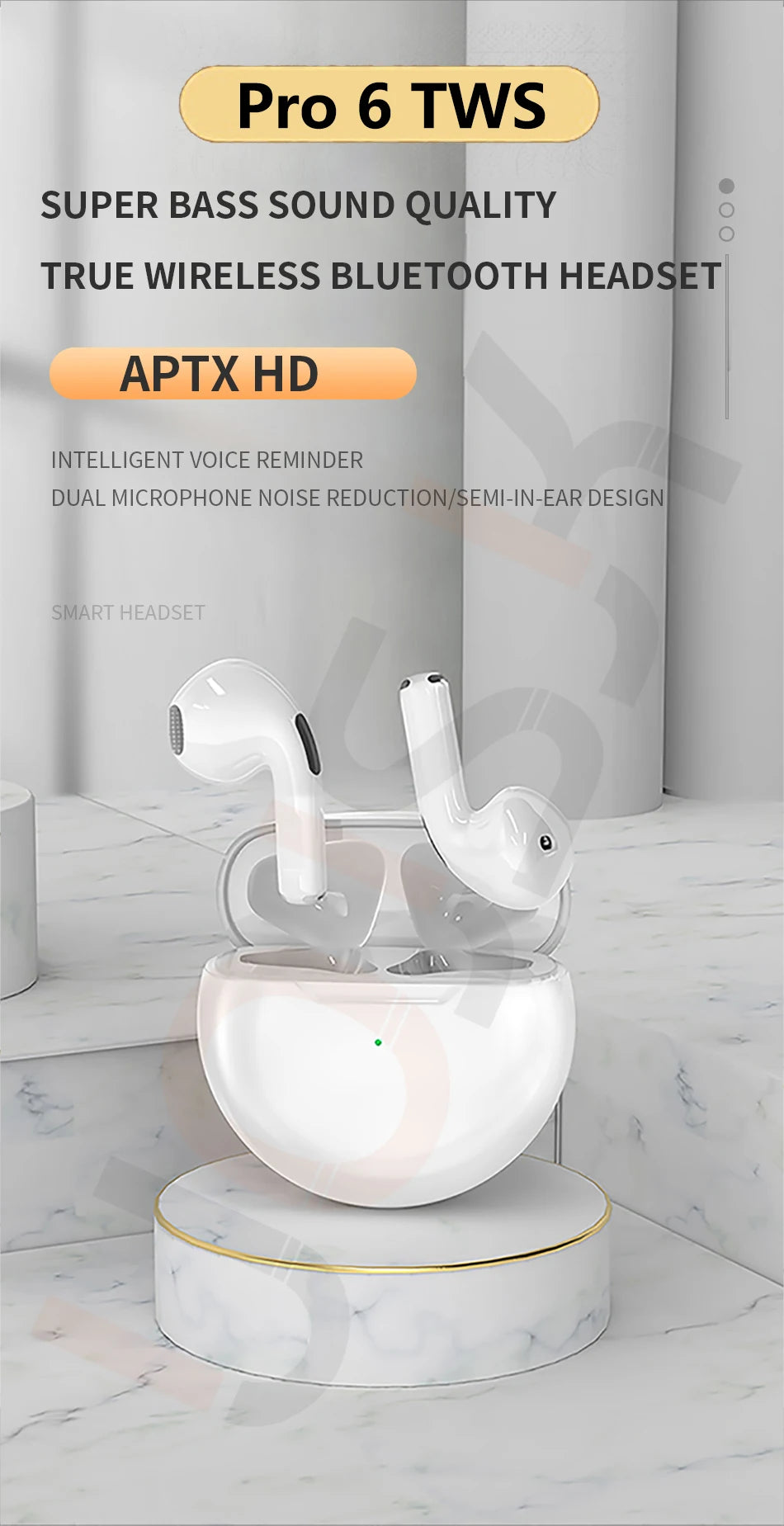 Enjoy crystal-clear audio with the Pro 6 TWS Bluetooth Earbuds. Designed for comfort, long playtime, and instant pairing—anytime, anywhere.